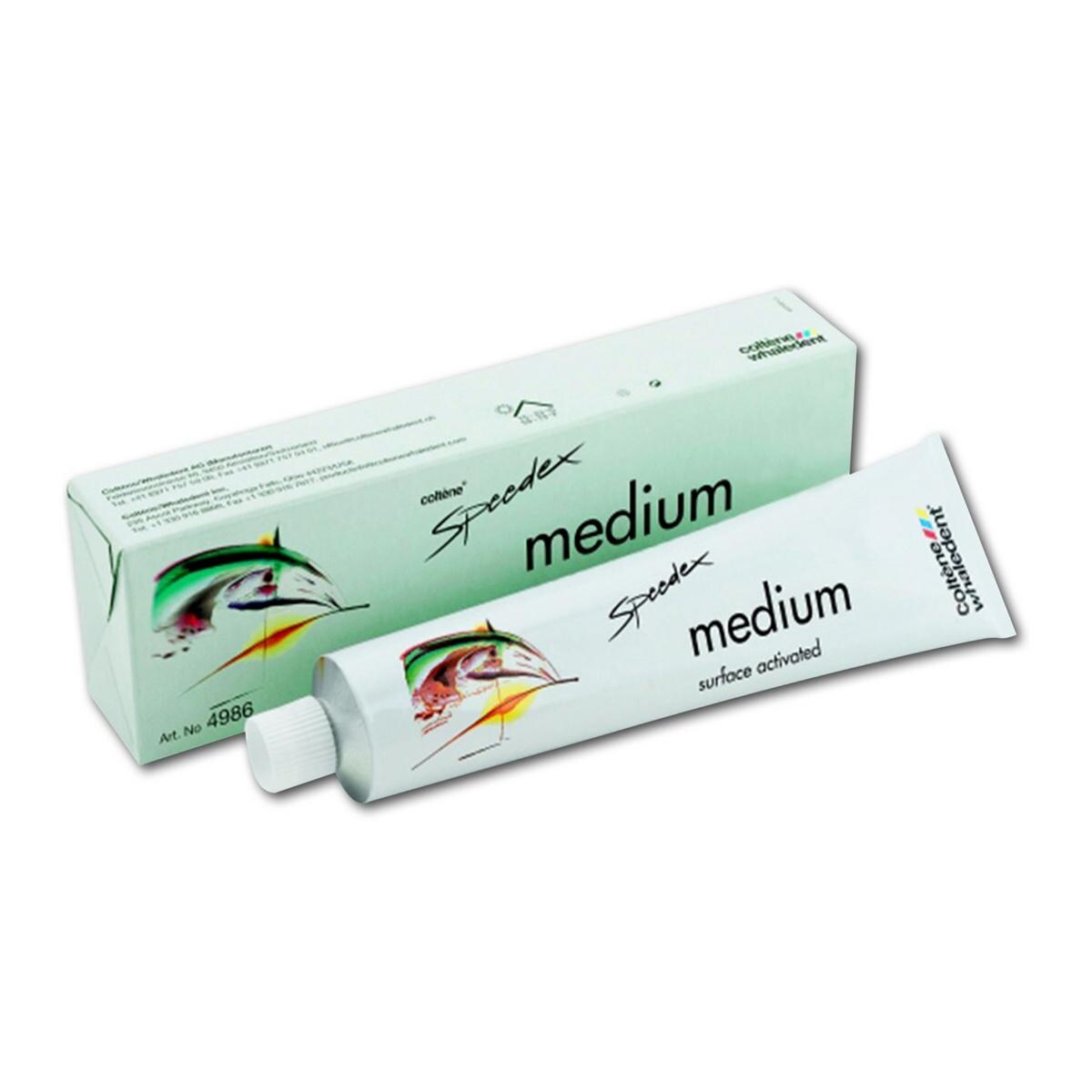 Speedex Medium heeft uitstekende bevochtigings- en vloei-eigenschappen. Speeksel en bloed worden door Speedex verdrongen en hebben geen negatieve bijwerkingen. Met de variabele uithardingstijd van Speedex kunnen de belangrijke mucosale bewegingen, die nodig zijn voor de volledige en partiële prothese-techniek, zeer nauwkeurig worden uitgevoerd. De precisie-afdruk is de sleutel tot een nauwkeurig passend kunstgebit.