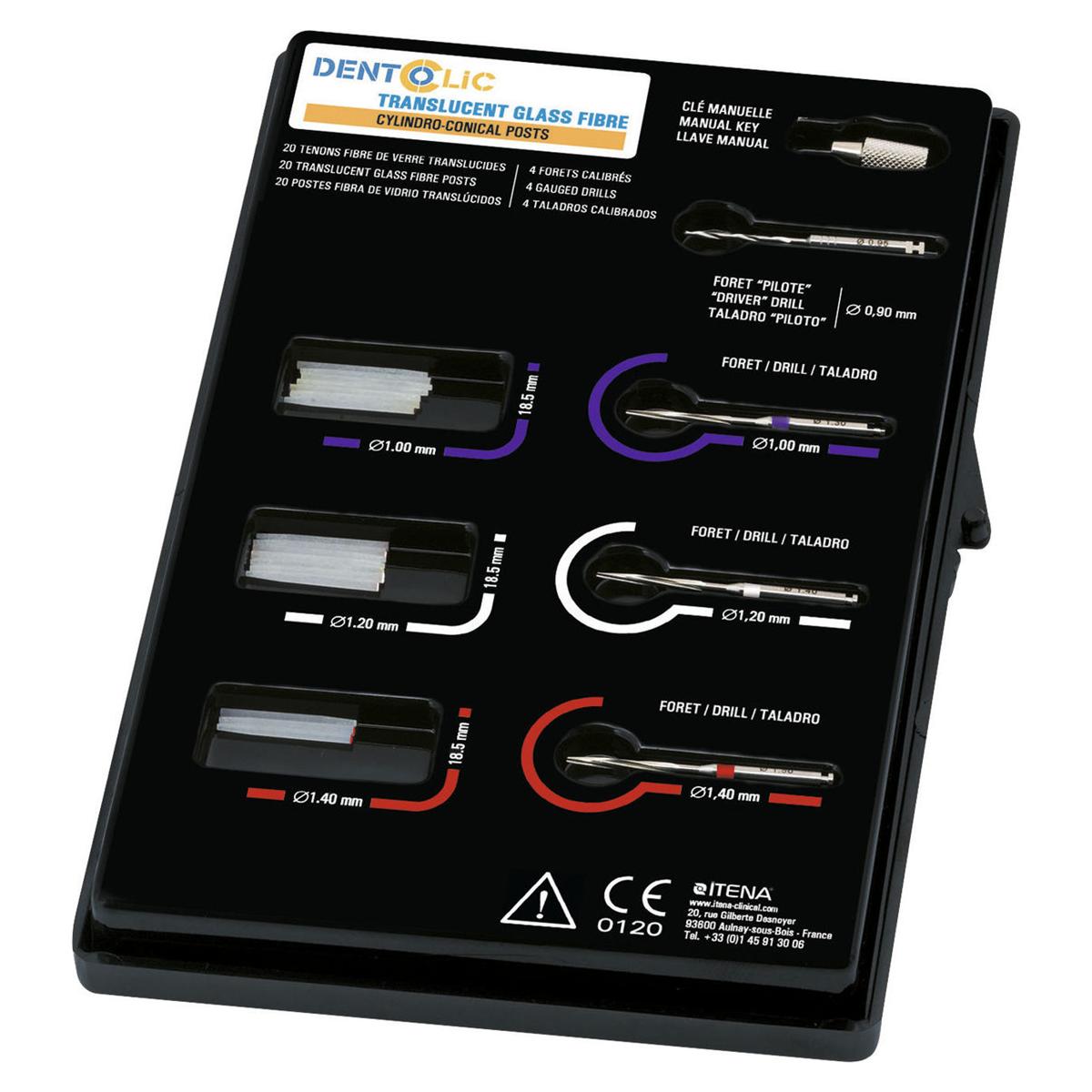 Bevat 20 glasvezelstiften (6 paars, 6 wit, 4 geel en 4 rood), penetratieboor, 4 cylindroconische boren, 1 manuele sleutel en accessoires