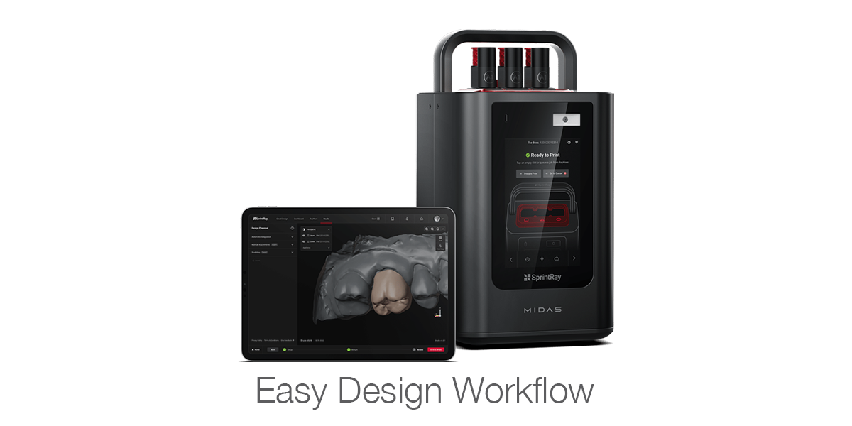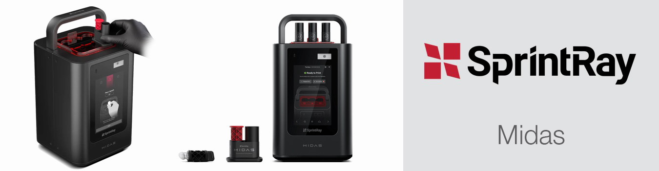 Midas est l'imprimante 3D par excellence pour la fabrication de restaurations au fauteuil. Elle utilise la stéréolithographie par pression numérique (DPS) en instance de brevet. Cela permet de surmonter les difficultés liées à l'impression de matériaux visqueux hautement chargés, et d'imprimer 3 couronnes, 6 inlays ou 9 facettes en moins de 10 minutes. Au lieu d'une plate-forme de construction, d'un réservoir de fluide et de bouteilles de fluide séparés, Midas utilise une capsule de résine tout-en-un à usage unique qui contient tout ce qui est nécessaire à l'impression d'une restauration.