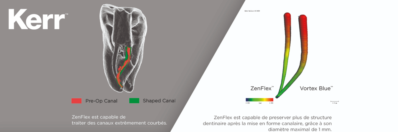 “L’instrument de mise en forme Zenflex possede des cannelures avec des degrés d’angles variables, ce qui empèche la lime d’être aspirée dans les canaux et offre un grand espace de stockage des débris entre les cannelures et aide à prévenir la rupture de l’instrument à la pointe. Ces instruments sophistiqués permettent d’obtenir des formes dans les canaux sans se déporter gràce à leur traitement thermique variable. La personalisation du traitement thermique pour chaque taille d’instrument produit des limes plus petites avec plus de mémoire de forme pour prévenir les fausses routes et les limes ont donc une ductulité remarquable. L’instrument a également un diamètre de cannelure maximum de 1 mm afin de mieux préserver la dent après un traitement canalaire. les pointes de gutta percha Autofit de Kerr s’adaptent bien à la forme du canal préparé par les limes Zenflex.”