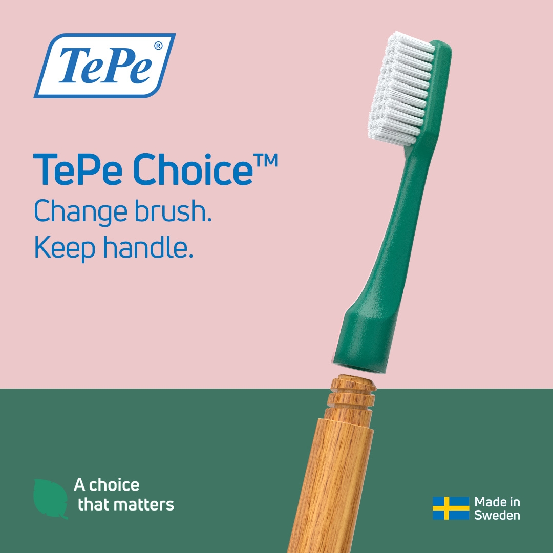 Het handvat van de TePe Choice is gemaakt van Zweeds beukenhout, met een plantaardige coating wat vochtopname minimaliseert. De verwisselbare borstelkoppen zijn gemaakt met plantaardige grondstoffen. In een 100% recyclebare kartonnen verpakking zitten drie borstelkoppen, dus met een product ben je goed voor negen maanden poetsen. Minder plastic en dus minder afval!